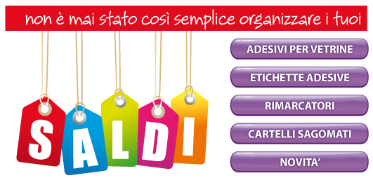 Soluzioni per organizzare i saldi, sconti o vendite promozionali. Adesivi per vetrine e per interni, etichette adesive, decorazioni per negozi e case .... e molto altro ancora...