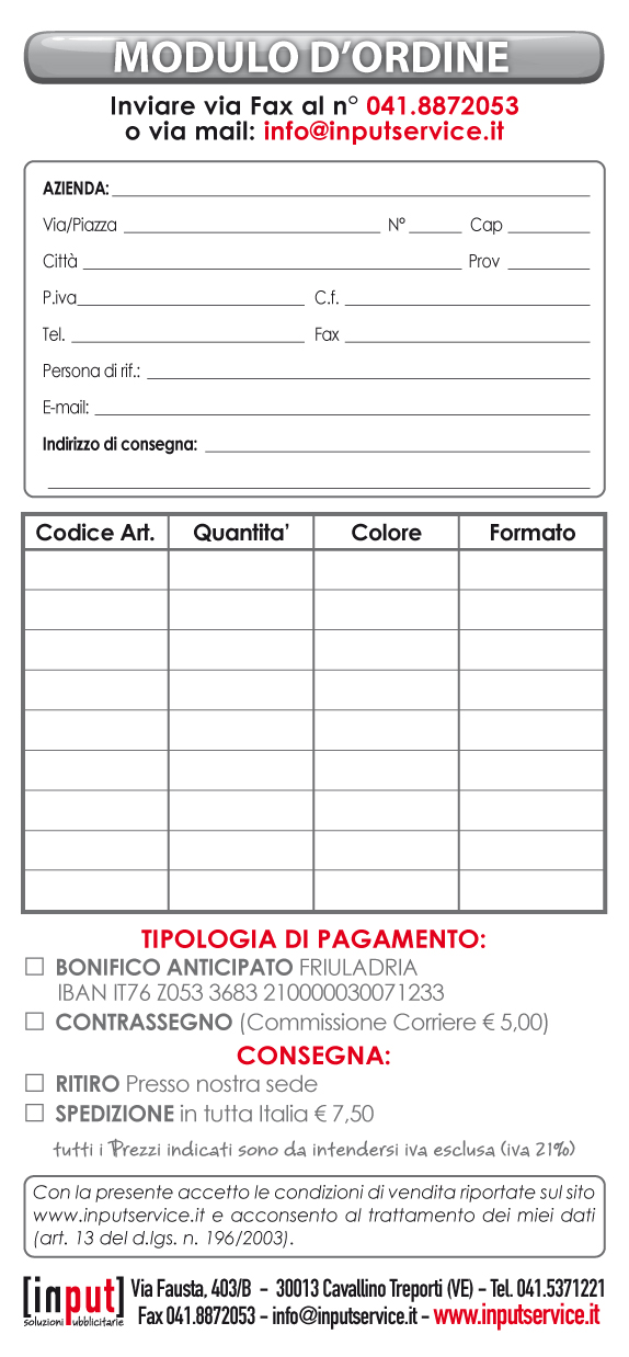 LA VERSIONE COMPILABILE ONLINE NON E' ANCORA DISPONIBILE INVITIAMO A STAMPARE IL MODULO E INVIARLO TRAMITE E-MAIL O VIA FAX.